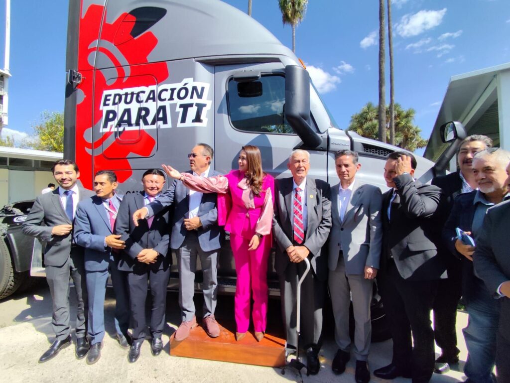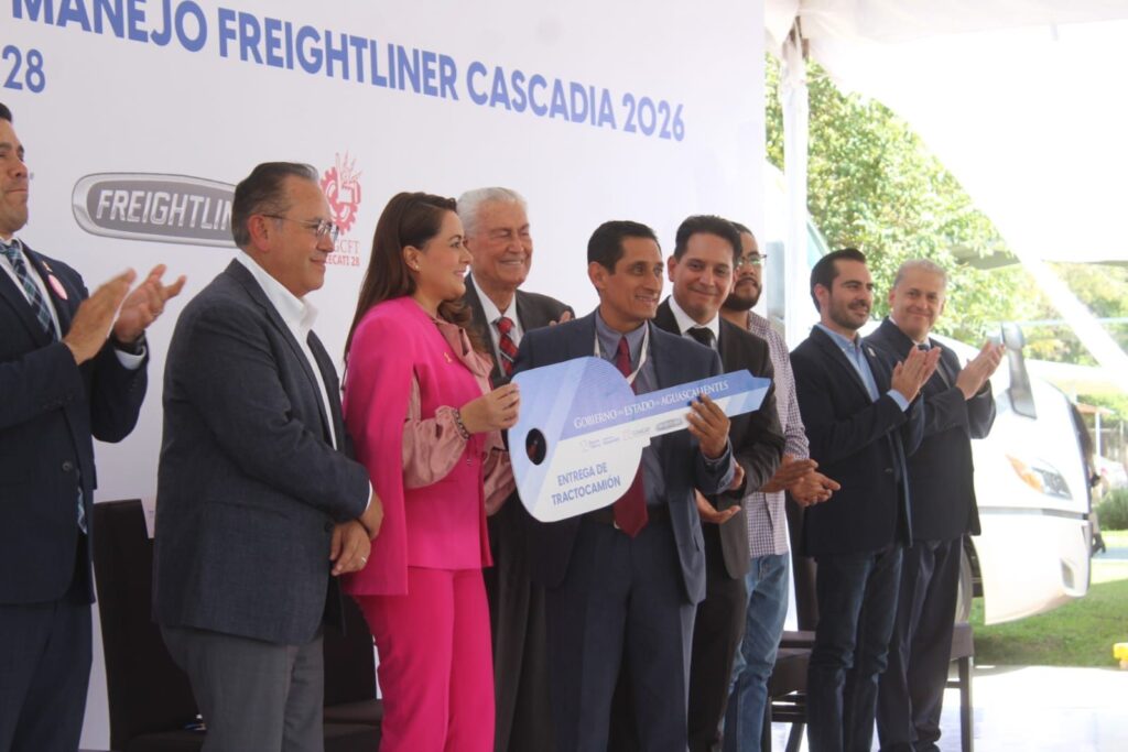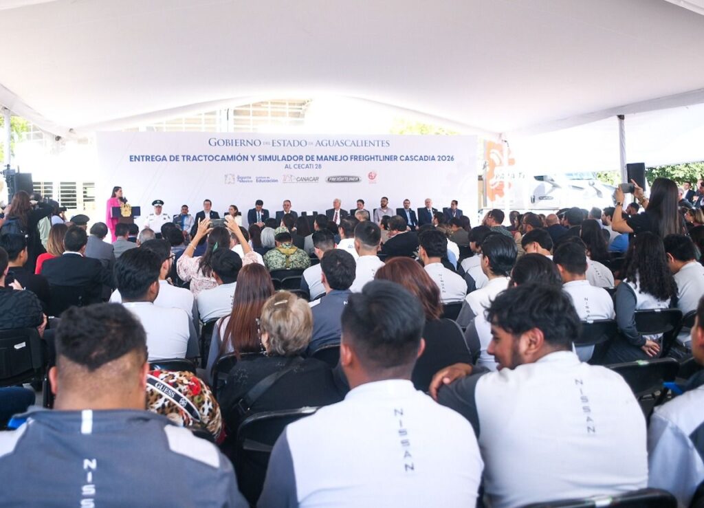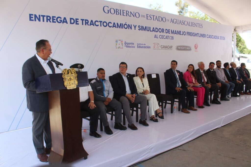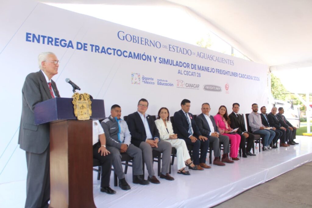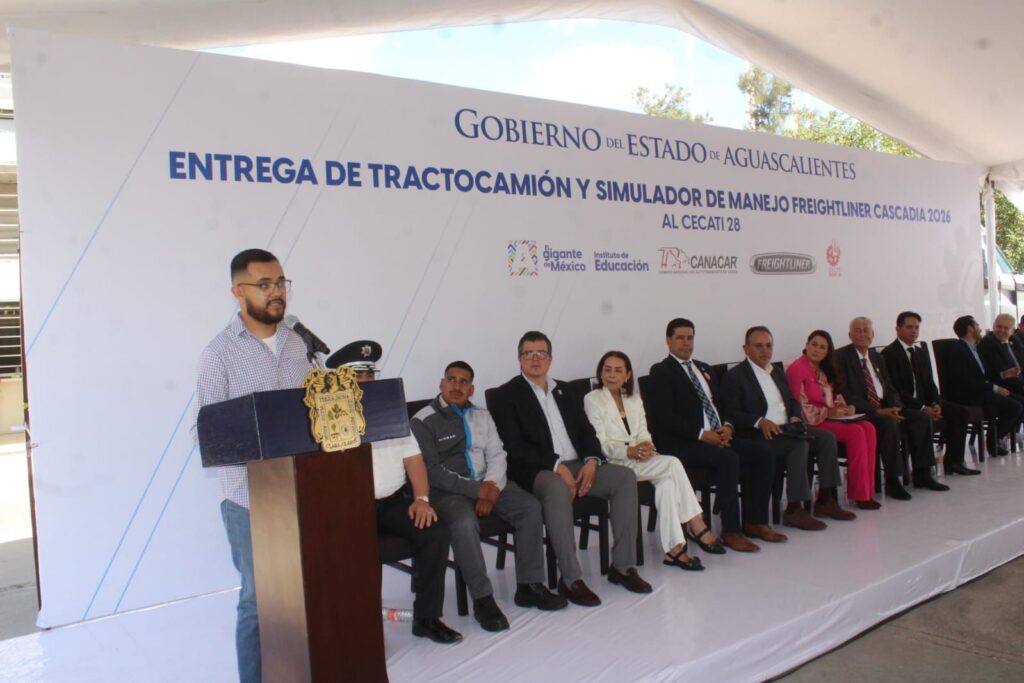 La gobernadora de Aguascalientes, Tere Jiménez, encabezó la ceremonia de entrega de un simulador electrónico de autotransporte y un tractocamión Freightliner Cascadia 2026 al Centro de Capacitación para el Trabajo Industrial No. 28 (Cecati No. 28); estos equipos de vanguardia fortalecerán las prácticas de los estudiantes y elevarán la calidad de la enseñanza.