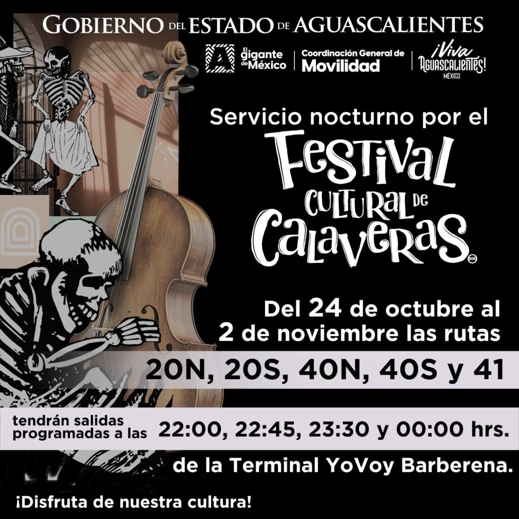 La Coordinación de Movilidad del Gobierno del Estado de Aguascalientes, informó que para que las personas puedan disfrutar con mayor facilidad de las actividades de este importante evento, del 24 de octubre al 2 de noviembre las rutas 20N, 20S, 40N, 40S y 41 saldrán de la Terminal YoVoy Barberena a las 22:00, 22:45, 23:30 y 00:00 horas.