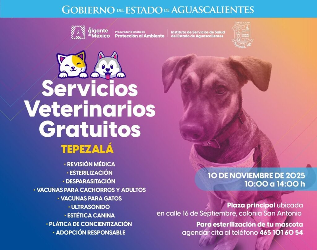 En Tepezalá, la brigada se realizará el lunes 10 de noviembre de 10:00 a 14:00 horas en la plaza principal. Para esterilizaciones, agenda tu cita al 465 101 60 54.