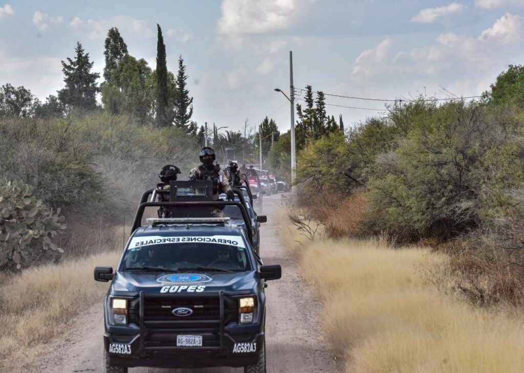 Integrantes de la Policía Estatal, en coordinación con el Ejército Mexicano y la Guardia Nacional, intensificaron patrullajes y la instalación de puntos de control en carreteras, caminos rurales y brechas de terracería, especialmente en los municipios de El Llano, Asientos, Tepezalá, Calvillo, San José de Gracia, Cosío y Aguascalientes.