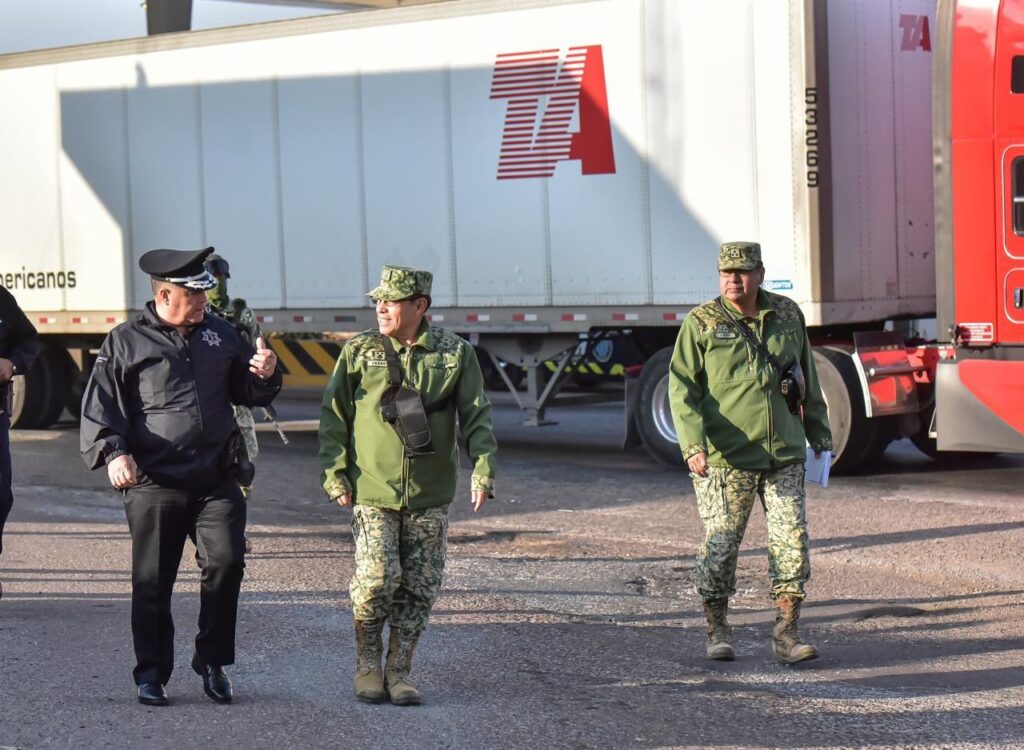 El secretario de Seguridad Pública del Estado, Antonio Martínez Romo, y el general Álvaro Javier Juárez Vázquez, nuevo comandante de la 14/a. Zona Militar, realizaron la mañana de este viernes un recorrido de supervisión en la Puerta de Seguridad Sur, la cual opera las 24 horas del día con presencia permanente de la Policía Estatal, personal del Ejército Mexicano y Guardia Nacional, a fin de llevar a cabo revisiones de vehículos y personas.