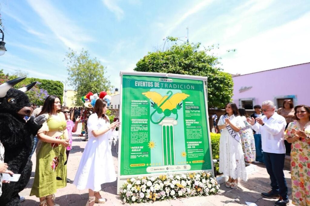 Durante el acto protocolario, las autoridades presentes, junto con la reina de la edición 2025, Daniela Martínez, la reina electa de la FNSM 2026, Alexa González, y sus princesas Andy Díaz y Mina J. Sevilla, participaron en la develación de los bandos solemnes colocados en cada una de las cuatro puertas del Jardín de San Marcos.